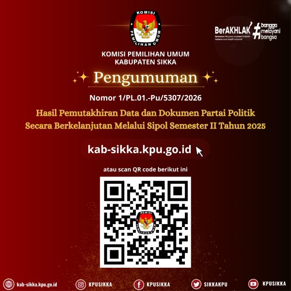 #TemanPemilih berikut pengumuman Nomor 1/PL.01-Pu/5307/2026 tentang Hasil Pemutakhiran Data dan Dokumen Partai Politik Secara Berkelanjutan Melalui Sipol Semester II Tahun 2025. Simak informasi selengkapnya dengan klik link berikut: https://drive.google.com/file/d/1CdNneY1jMz6LsXSepzqebaiw5NiC84Z-/view ....