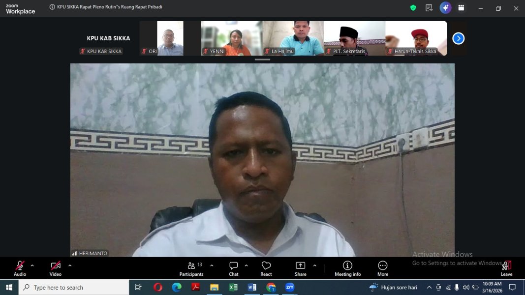 Maumare, kab-sikka.kpu.go.id. Komisi Pemilihan Umum (KPU) Kabupaten Sikka, melaksanakan Rapat Pleno Rutin membahas perencanaan kegiatan Mingguan Secara daring melalui Zoom Meeting, Senin (16/3/26). Rapat tersebut dipimpin Ketua KPU Sikka, Herimanto diikuti Anggota, Harun Al Rasyid, Ignasius Irvanto Chandra Say, La Hajimu dan Yosef Fredianus Boy Gapo, dan Plt. Sekretaris, Semuel Desryanto Sing. Agenda rapat yakni, mendengarkan Tindak Lanjut (TL) keputusan pleno sebelumnya dan Pembahasan rencana kegiatan mingguan setiap divisi dan sub bagian. Untuk Divisi Perencanaan Data dan Informasi (Rendatin) membahas Helpdesk layanan Pemutakhiran Data Pemilih Berkelanjutan (PDPB), Mempersiapkan Rapat Pleno Rekapitulasi Data Pemilih Berkelanjutan Triwulan I Tahun 2026, Laporan Dokumen E-Monev menunggu Aplikasi di buka, dan Melakukan Patroli Medsos; Sementara Divisi Teknis Penyelenggaraan mengagendakan Layanan Helpdesk Pemutakhiran Data Partai Politik Berkelanjutan, Pengarsipan Dokumen Teknis, Penulisan Buku Teknis, Menyiapkan Rancangan Tor dan RAB untuk kegiatan Teknis menyesuaikan dengan Anggaran, dan Membuat Standar Oprasional Prosedur terkait Penggantian Antarwaktu, dan Menindaklanjuti Permintaan KPU Provinsi NTT terhadap dokumen C Hasil dan D hasil; Kemudian Divisi Sosialisasi, Pendidikan Pemilih, Partisipasi Masyarakat (Sosdiklih Parmas) dan Sumber Daya Manusia (SDM) membahas Sosialisasi dan publikasi Kegiatan pada laman Media Sosial KPU Sikka dan Website, Layanan PPID (Pejabat Pengelola Informasi dan Dokumentasi), Monitoring Pelatihan ASN (SIMPEL), dan Koordinasi kerja sama bersama BPJS Ketenagakerjaan; Kemudian Divisi Hukum dan Pengawasan membahas Publikasi dan edukasi produk hukum melalui Jaringan Dokumentasi Informasi Hukum (JDIH), Legal drafting produk hukum, dan Pencermatan draf Standar Oprasional Prosedur terkait Penggantian Antarwaktu secara daring; Terakhir Divisi Keuangan Umum dan Logistik (KUL) membahas tentang Layanan Helpdesk Laporan Pertanggungjawaban Badan Adhoc Anggaran Hibah Pemilihan Gubernur, Rutinitas perkantoran dan keuangan, Tindaklanjut Laporan LHP Badan Pemeriksa Keuangan, dan Penyusunan Laporan Srikandi, Pengelolaan dan Penyelamatan Arsip, serta Laporan Ahli Media; Hadir mengikuti rapat tersebut yakni Kepala Sub Bagian (Kasubag) Rendatin, Cornelius Mauritius, Kasubag Teknis Penyelenggara Pemilu, Simon Doni Tukan, Pejabat Fungsional Penata Kelola Pemilu, Cornelian W. J Pati, Mario L T Date, Jessy M M P Hayon dan Staf Sekretariat. (humaskpusikka*/) ....