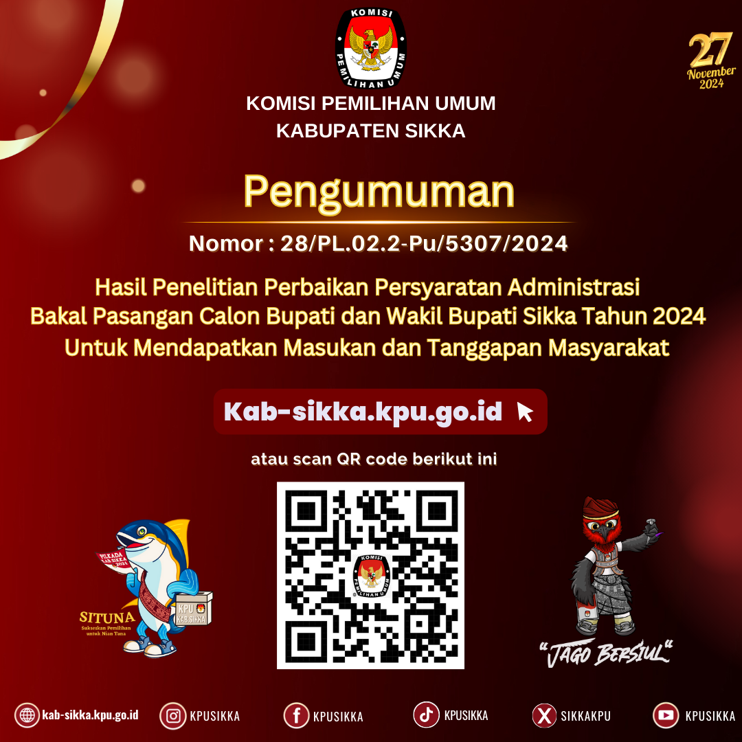 #TemanPemilih berikut disampaikan Pengumuman Nomor 28/PL.02.2-Pu/5307/2024 tentang Hasil Penelitian Perbaikan Persyaratan Administrasi Bakal Pasangan Calon Bupati dan Wakil Bupati Sikka Tahun 2024 Untuk Mendapatkan Tanggapan Masyarakat