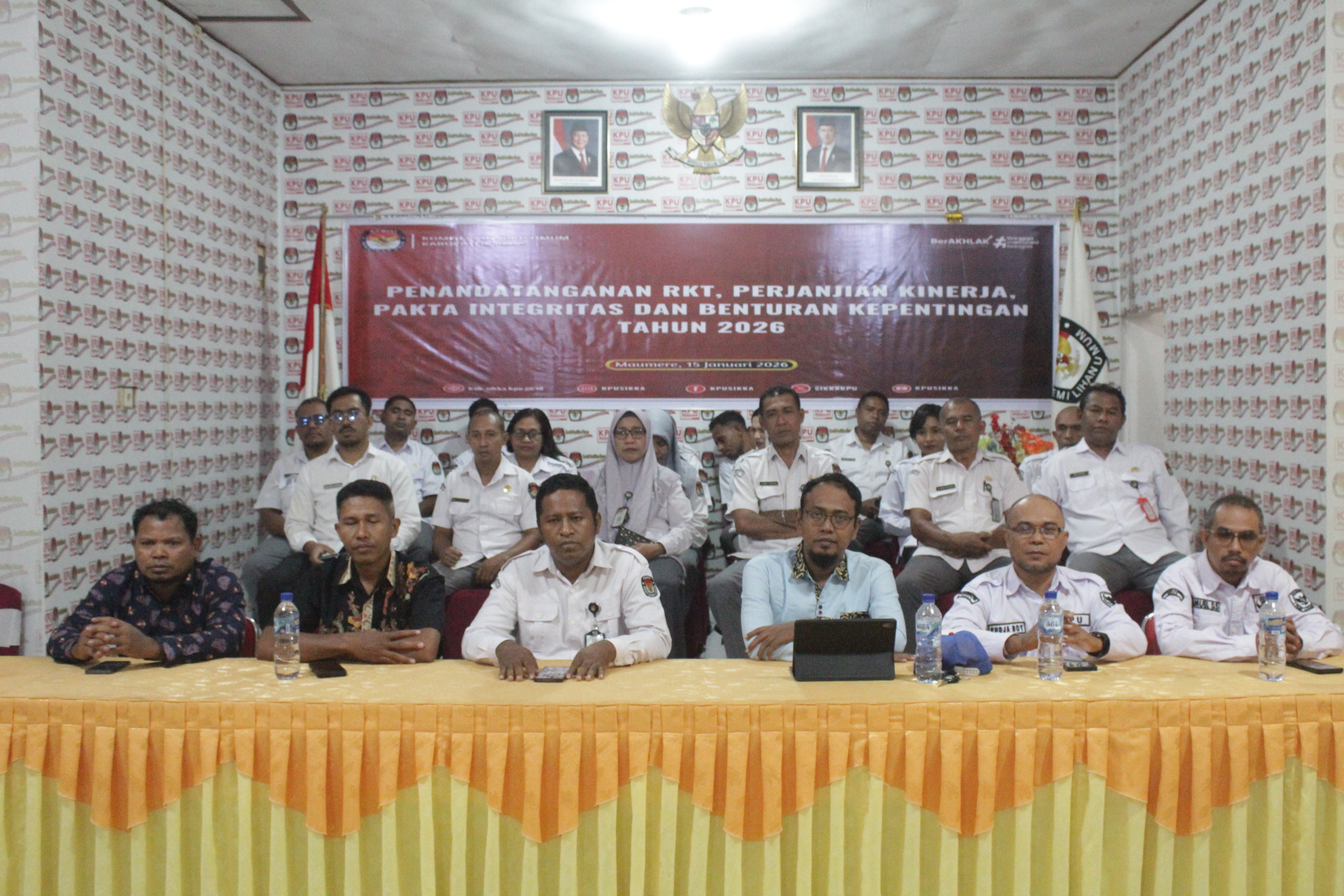 “Dengan adanya penandatanganan perjanjian kinerja, pakta integritas, rencana kegiatan tahunan dan benturan kepentingan bagi seluruh jajaran, tidak hanya bersifat ceremonial administrasi saja melainkan menjadi wujud nyata komitmen integritas dan tanggungjawab seluruh jajaran KPU dalam menjalankan amanat sebagai Penyelenggara Pemilu”, tegas Jemris.
