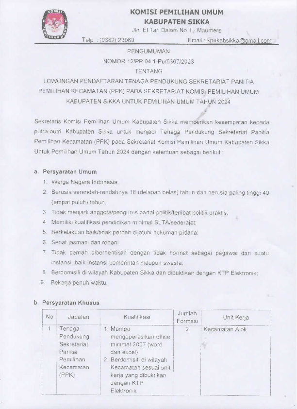#TemanPemilih Berikut disampaikan Pengumuman Nomor 12/PP.04.1-Pu/5307/2023 Tentang Lowongan Pendaftaran Tenaga Pendukung Sekretariat Panitia Pemilihan Kecamatan (PPK) Pada Sekretariat Komisi Pemilihan Umum Kabupaten Sikka Untuk Pemilu Tahun 2024. Yuuk simak informasi selengkapnya