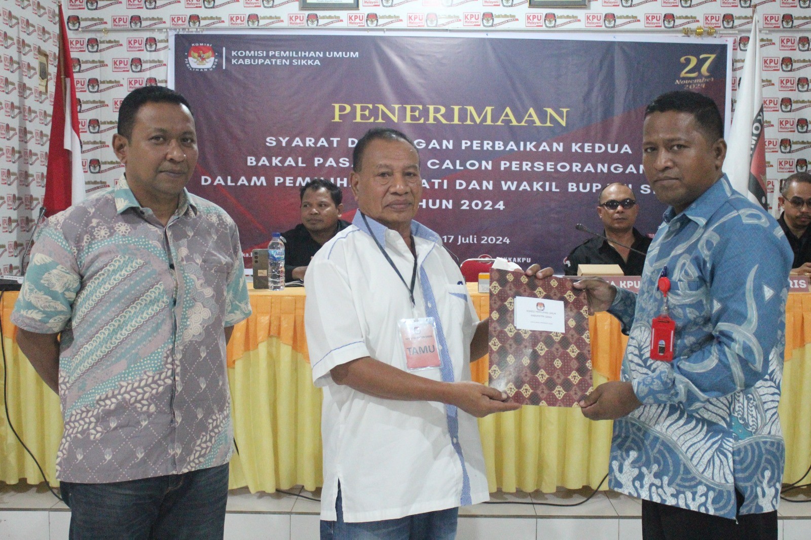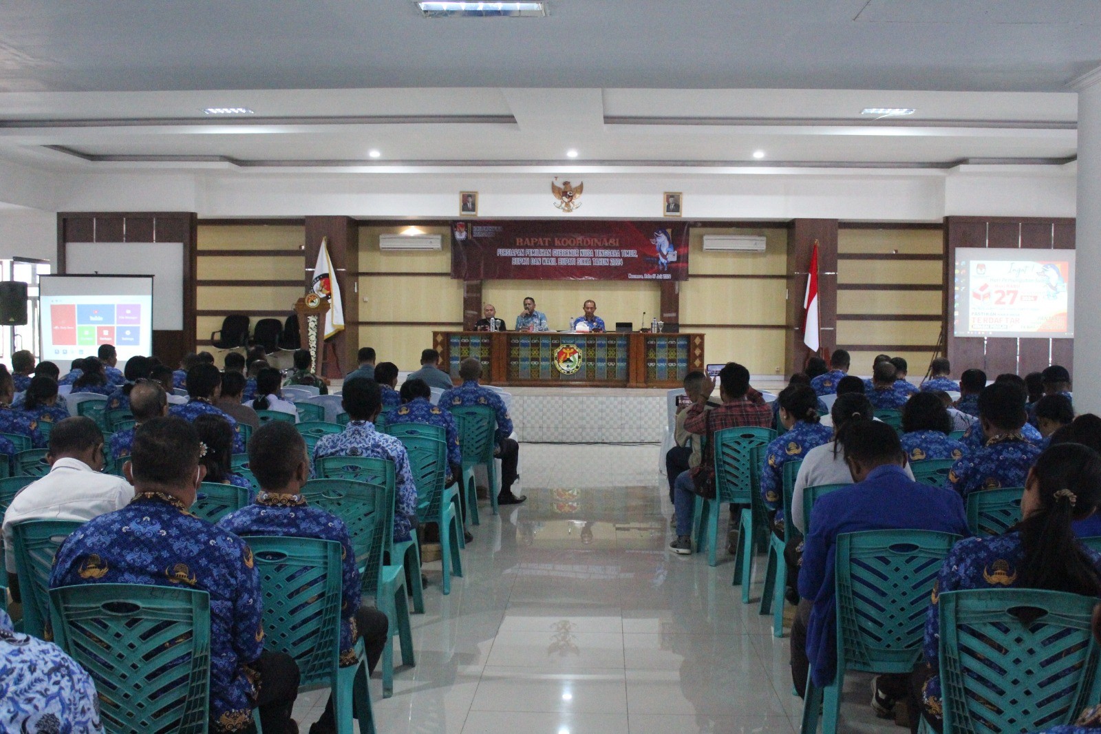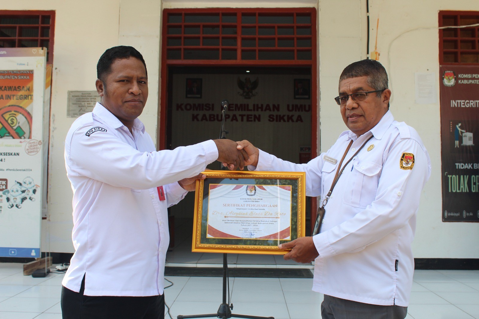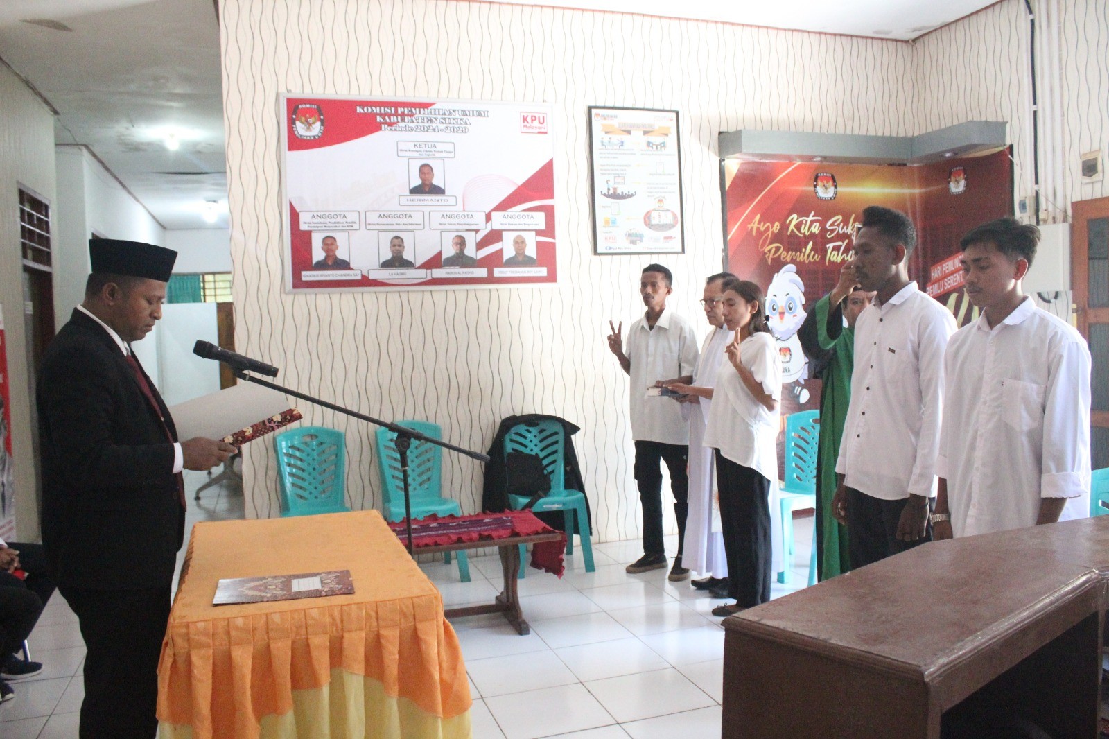 Maumere---- Ketua Komisi Pemilihan Umum Kabupaten Sikka, Herimanto melantik Pengganti Antarwaktu (PAW) Penyelenggara Adhoc Pemilihan Kepala Daerah (Pilkada) Serentak Tahun 2024 di Kantor KPU Sikka, Sabtu (20/7/24). Acara pelantikan didahului pembacaan surat keputusan, kemudian pengucapan sumpah janji didampingi pendamping rohani, Pater Teleforus Jenti dan Ustad Abdurahman dilanjutkan penandatanganan pakta integritas. Penyelenggara Adhoc yang dilantik, 1 orang Anggota PPK Kecamatan Alok dan 3 orang Anggota PPS masing-masing dari Desa Hoder Kecamatan Waigete, Desa Talibura Kecamatan Talibura dan desa Semparong Kecamatan Alok. Herimanto dalam sambutan meminta anggota yang baru saja dilantik cepat menyesuaikan diri dengan PPK, PPS yang sudah ada karena tahapan Pilkada sedang berjalan. “Hari ini saudara-saudara sudah resmi menjadi bagian penyelenggara Pilkada tingkat PPK dan PPS. Besok atau paling cepat hari ini segera lapor diri. Jadi, harus cepat menyesuaikan diri dengan teman-teman dengan tahapan sedang berjalan” tegasnya. Ketua KPU Sikka menambahkan, Penyelenggara Pilkada harus memastikan Pilkada berjalan sesuai dengan asas langsung, umum, bebas, rahasia, jujur dan adil dan dilakukan secara profesional. “Penyelenggara Pilkada 2024, tugas kita harus memastikan penyelenggaraan sesuai asas langsung, umum, bebas, rahasia, jujur dan adil secara profesional. Artinya dibutuhkan informasi, komunikasi dan koordinasi yang baik antara PPS atau PPK juga secara hierarki melalui arahan-arahan atau petunjuk”, kata Herimanto. Diketahui Penyelenggara Adhoc yang dilantik yakni Sirajudin Basri (PPK Alok), Wihelmus Noven (PPS Hoder), Yustina Odilia Fernandes (PPS Talibura), Muhammad Ical Saifar (PPS Semparong). Hadir pada saat pelantikan, Anggota KPU Harun Alrasyid, Yosef Fredianus Boy Gapo, Ignasius Irvanto Candra Say dan La Hajimu didampingi Plt. Sekretaris KPU Sikka, Samuel Desryanto Sing beserta staf ASN. (humaskpusikka/*)