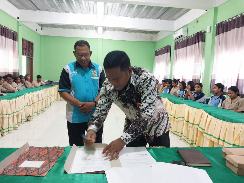 Maumere, kab-sikka.kpu.go.id Komisi Pemilihan Umum (KPU) Kabupaten Sikka dan Sekolah Menengah Kejuruan (SMKS) Yohanes XXIII Maumere secara resmi menjalin kerja sama pendidikan pemilih melalui Program KPU Mengajar (PKM). Kerja sama tersebut ditandai dengan Penandatanganan Nota Kerja Sama yang dilakukan oleh Ketua KPU Sikka, Herimanto dan Kepala Sekolah SMKS Yohanes XXIII Maumere, Bernadus Badar di SMKS Yohanes XXIII Maumere pada Jumat (30/2/26) Ketua KPU Sikka, Herimanto didampingi Ketua Divisi Sosdiklih, Parmas dan SDM Ignasius Irvanto C. Say dan Plt, Sekretaris, Samuel Desryanto Sing dalam sambutan usai penandatanganan, menyampaikan bahwa dengan kegiatan ini dapat meningkatkan kualitas partisipasi pemilih dengan kesadaran penuh untuk terlibat dalam Pemilu atau Pilkada. Kedua yakni meningkatkan pengetahuan tentang kepemiluan. “Berikut tantangan serius bagi generasi mudah untuk melawan hoax karena saat ini kita berada pada fase keterbukaan informasi yang tanpa penyaring melalui media sosial. Ini juga untuk meningkatkan pendidikan dan literasi kepemiluan bagi pelajar, khususnya pemilih pemula”, Kata Herimanto. Kepala SMKS Yohanes XXIII Maumere, menyambut baik dan mengucapkan terima kasih karena ada suatu moment yang sangat berharga hari ini dalam program KPU mengajar untuk memberikan pendidikan pemilih. “Jadi apa yang disampaikan tolong disimak baik-baik sebagai masa depan untuk adik-adik”, Kata Bernadus. Dihadapan Kepala Sekolah, Herimanto menyampaikan bahwa melalui kegiatan PKM, peserta diharapkan memperoleh pemahaman yang lebih baik tentang kepemiluan di Indonesia serta pentingnya menjadi pemilih cerdas dalam setiap proses demokrasi. Hadir dalam kesempatan tersebut, Para Guru SMKS Yohanes XXIII Maumere, Para staf bagian Sosdiklih, Parmas dan SDM KPU Sikka bersama Perwakilan peserta didik. (humaskpusikka*/)