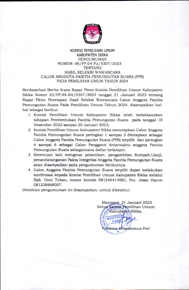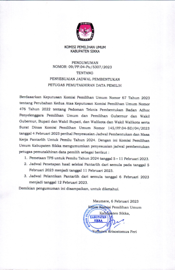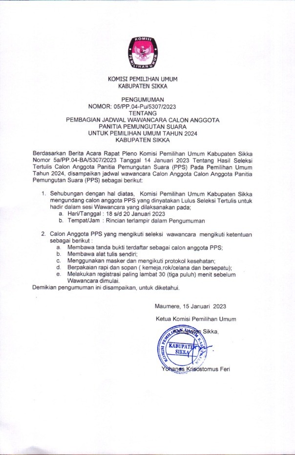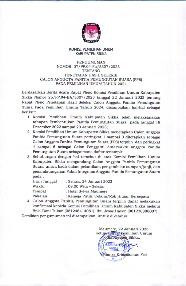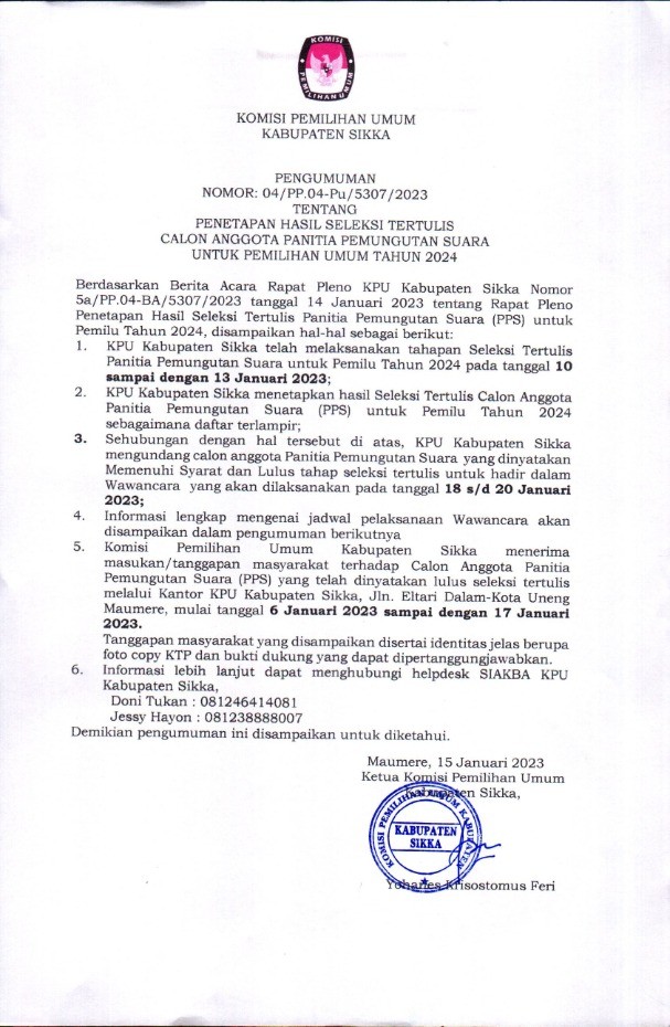 #TemanPemilih Berikut disampaikan Pengumuman Nomor 12/PP.04.1-Pu/5307/2023 Tentang Lowongan Pendaftaran Tenaga Pendukung Sekretariat Panitia Pemilihan Kecamatan (PPK) Pada Sekretariat Komisi Pemilihan Umum Kabupaten Sikka Untuk Pemilu Tahun 2024. Yuuk simak informasi selengkapnya